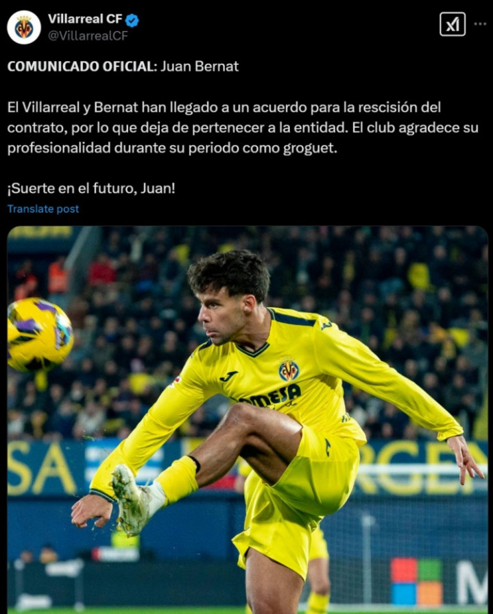 官方: 比利亚雷亚尔和贝尔纳特提前终止租借合同, 球员恢复自由身